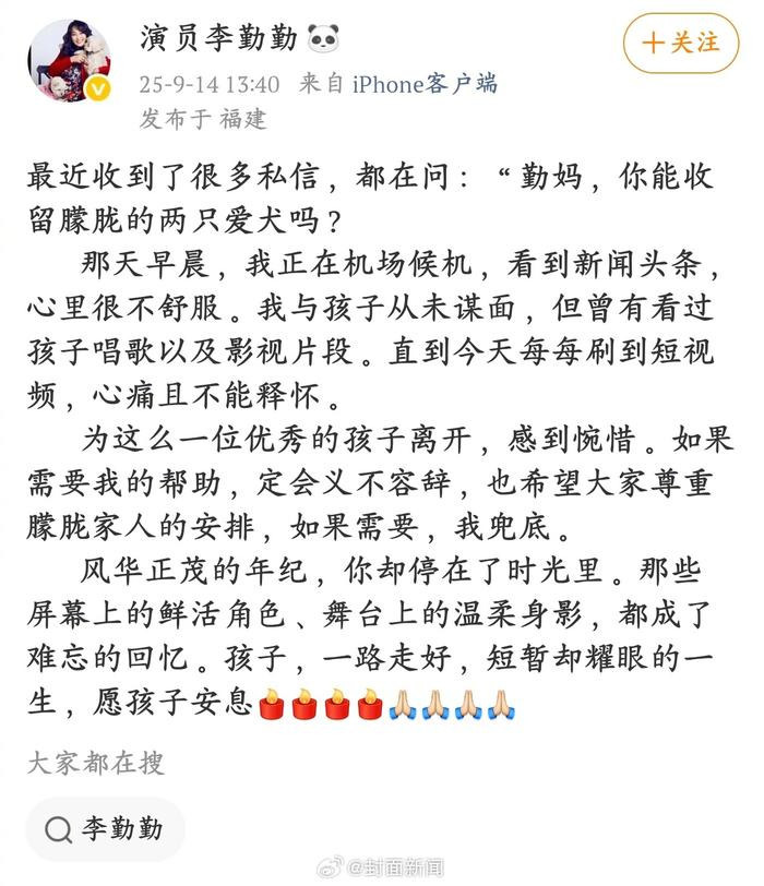 9月14日,@演员李勤勤发文:最近收到了很多私信,都在问:“勤妈,你能收留朦胧的两只爱犬吗?那天早晨,我正在机场候机,看到新闻头条,心里很不舒服。我与孩子从未谋面,但曾有看过孩子唱歌以及影视片段。直到今天每每刷到短视频,心痛且不能释怀。为这么一位优秀的孩子离开,感到惋惜。如果需要我的帮助,定会义不容辞,也希望大家尊重朦胧家人的安排,如果需要,我兜底。风华正茂的年纪,你却停在了时光里。那些屏幕上的鲜活角色、舞台上的温柔身影,都成了难忘的回忆。孩子,一路走好,短暂却耀眼的一生,愿孩子安息。#于朦胧[超话]#
