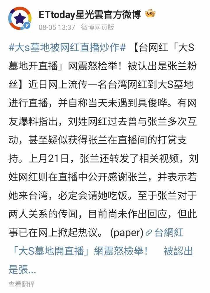 但大家并没有听张兰分享喜悦,而是提及刘姓主播去大S墓地直播的事情。
