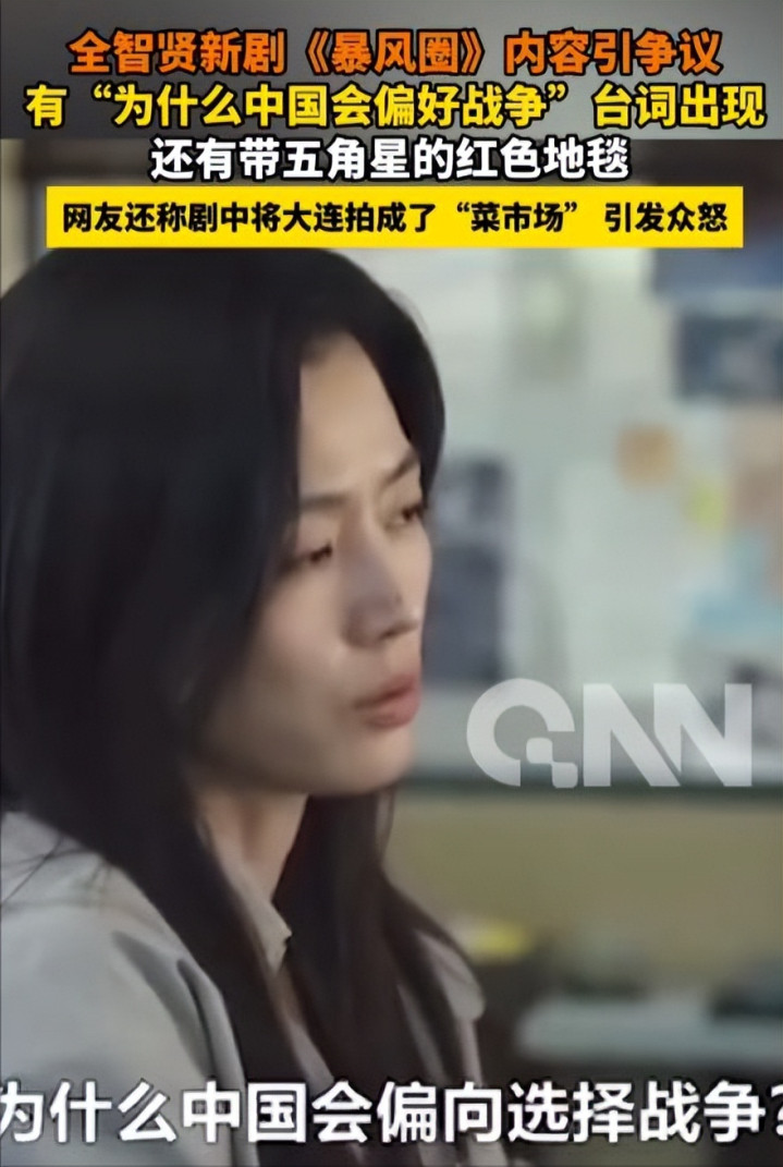 在新剧《暴风圈》中,全智贤的一句话让人全网震怒,剧中,全智贤饰演的角色有这样一句台词:“为什么中国会偏向选择战争?”