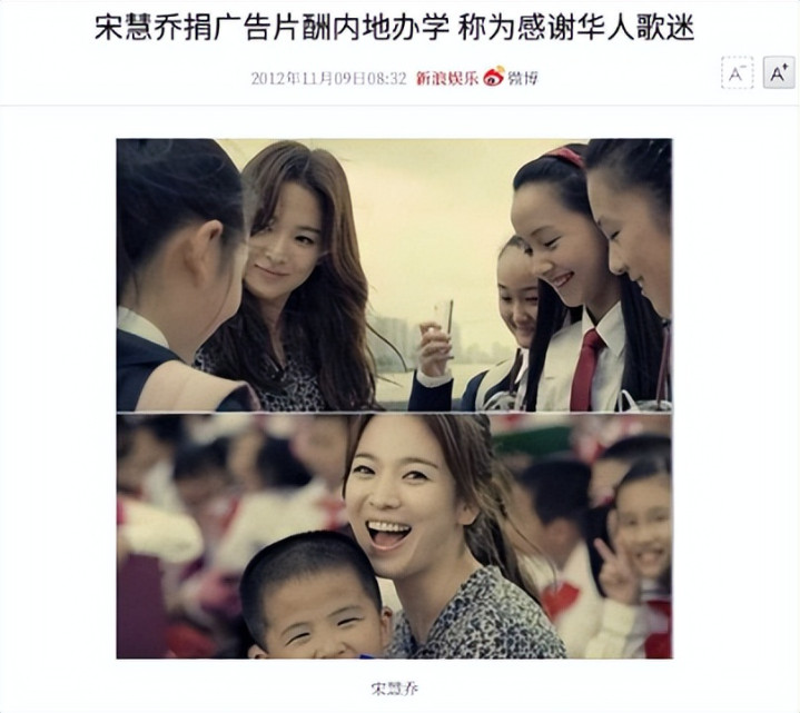 2012年的时候,宋慧乔赶赴中国内地拍摄公益广告,并且把所有的广告收入全部捐出,用作创建希望小学。