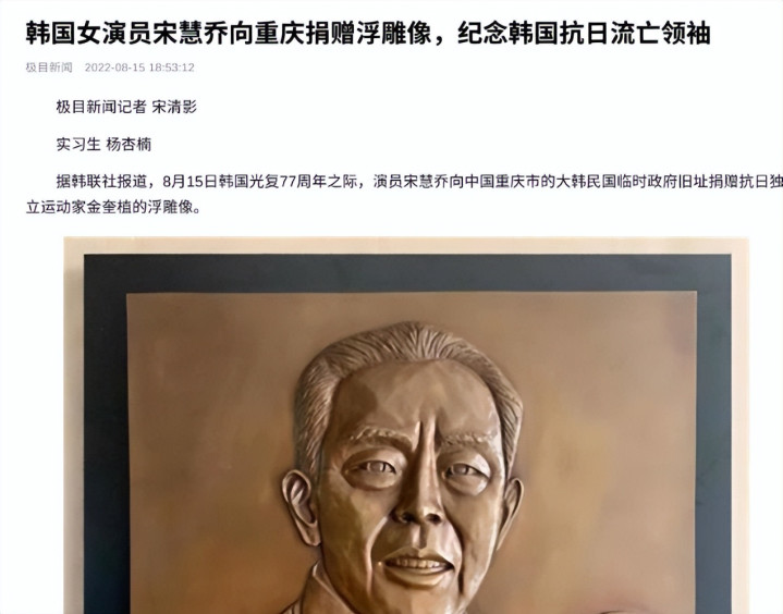 2021年,宋慧乔先后向浙江嘉兴市的韩国临时政府要员住址捐赠了金九先生浮雕,次年,又给重庆的韩要员住址捐赠了抗日独立运动家金奎植的浮雕。