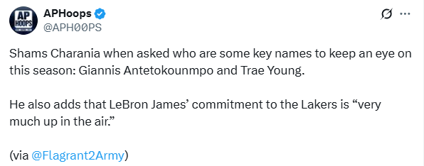 北京时间11月1日,ESPN名记shams在节目中表示,詹姆斯对未来没有定论,只要继续打球就可能离开湖人;shams还表示字母哥和特雷-杨的未来值得关注。